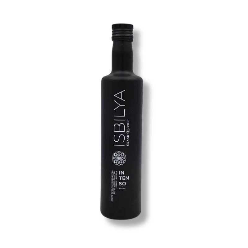 Isbilya Grand Coupage Intenso en un AOVE coupage arbosana-koroneiki de recolección temprana y extracción en frío.